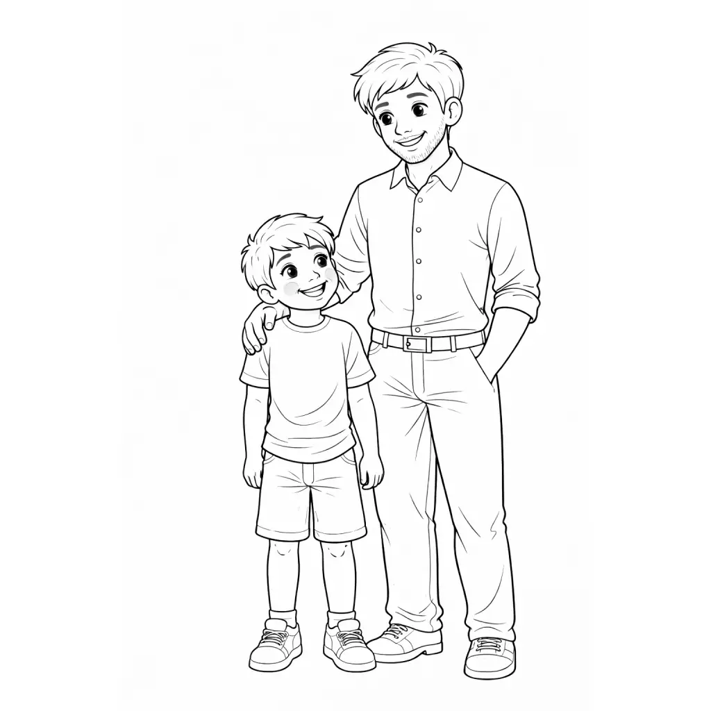 דף צביעה של אבא ובן לילדים בקטגוריה משפחה. מתאים לילדים מגיל 3 ומעלה, להדפסה בחינם עם קווים ברורים וציור ידידותי