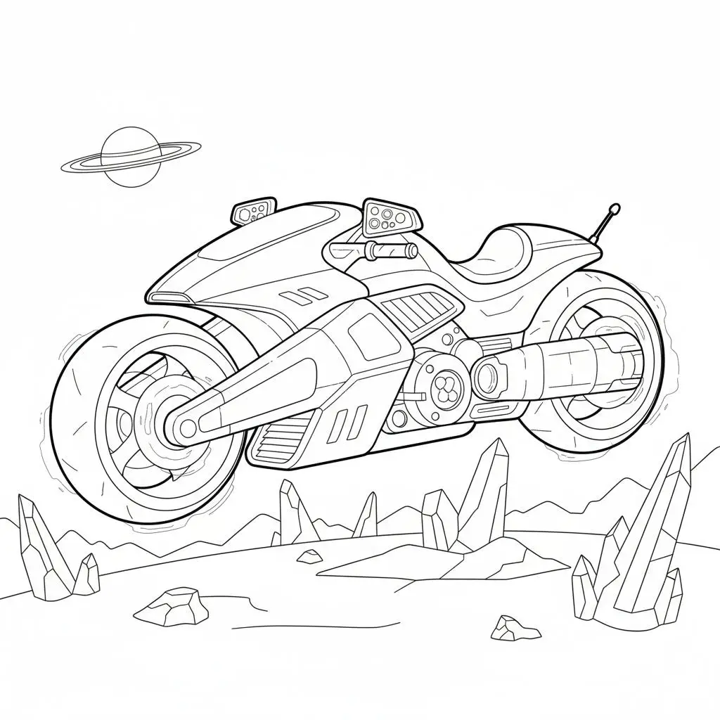 דף צביעה של אופנוע חלל לילדים בקטגוריה חלל וכוכבים. מתאים לילדים מגיל 3 ומעלה, להדפסה בחינם עם קווים ברורים וציור ידידותי