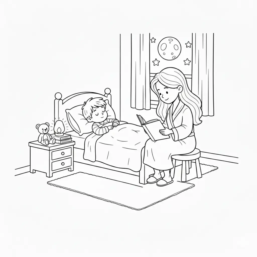 דף צביעה של אמא מקריאה סיפור לילדים בקטגוריה לילה טוב. מתאים לילדים מגיל 3 ומעלה, להדפסה בחינם עם קווים ברורים וציור ידידותי