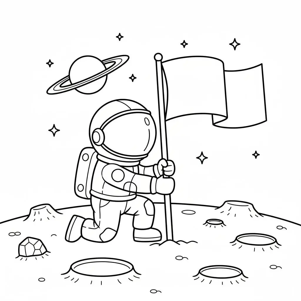 דף צביעה של דגל על הירח לילדים בקטגוריה חלל וכוכבים. מתאים לילדים מגיל 3 ומעלה, להדפסה בחינם עם קווים ברורים וציור ידידותי