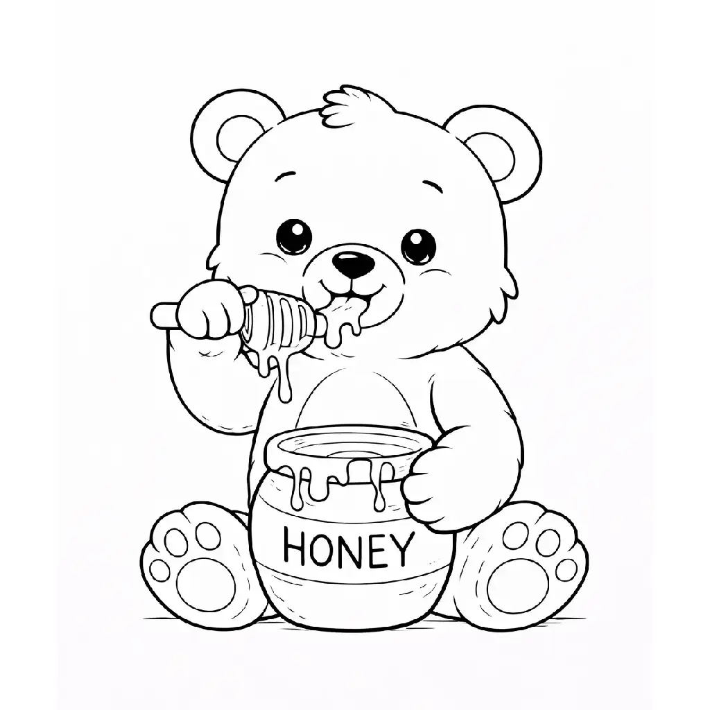 דף צביעה של דוב אוכל דבש לילדים בקטגוריה דובים. מתאים לילדים מגיל 3 ומעלה, להדפסה בחינם עם קווים ברורים וציור ידידותי