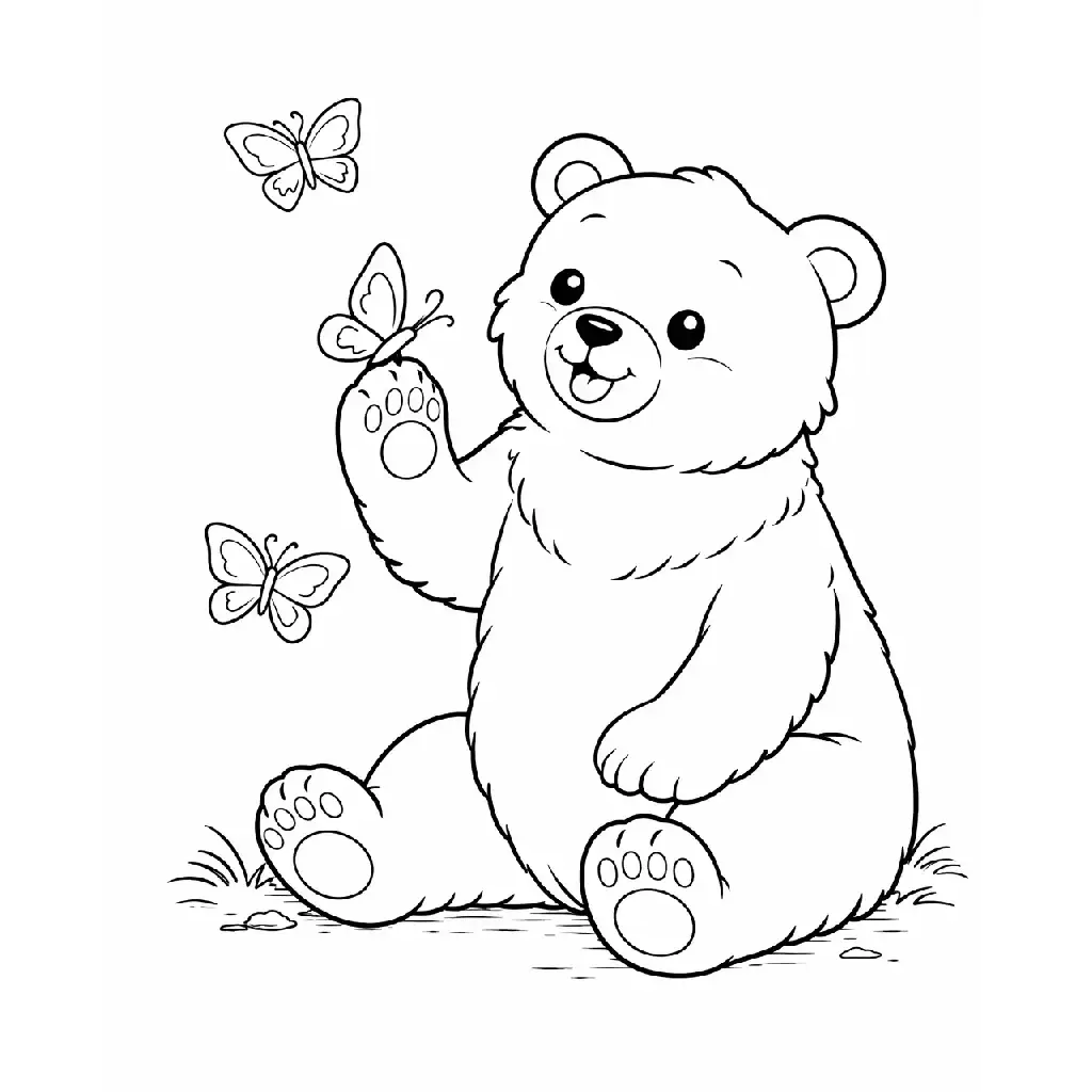 דף צביעה של דוב משחק עם פרפרים לילדים בקטגוריה דובים. מתאים לילדים מגיל 3 ומעלה, להדפסה בחינם עם קווים ברורים וציור ידידותי