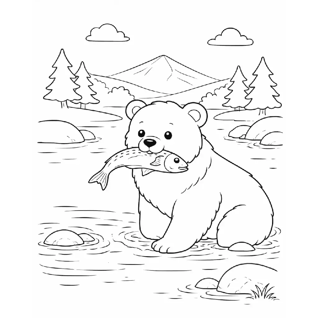 דף צביעה של דוב תופס דג לילדים בקטגוריה דובים. מתאים לילדים מגיל 3 ומעלה, להדפסה בחינם עם קווים ברורים וציור ידידותי