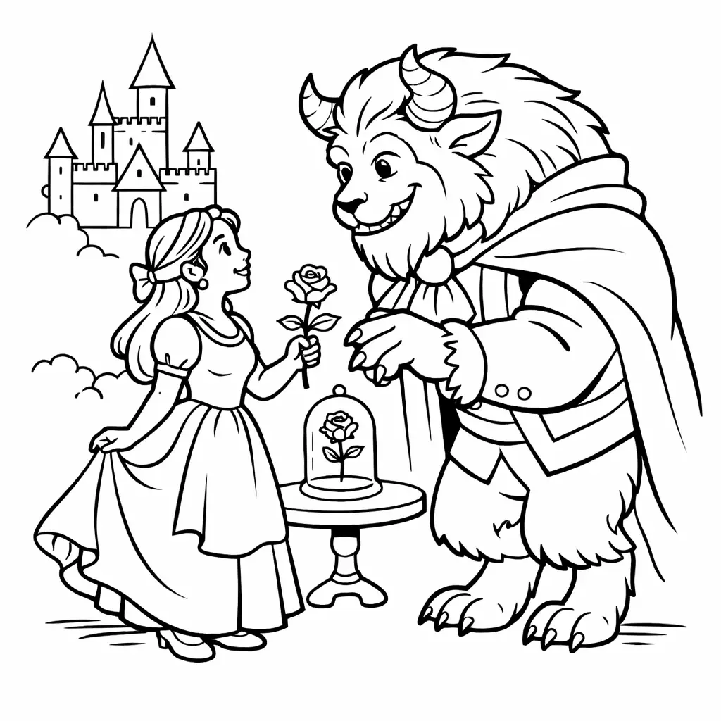 דף צביעה של היפה והחייה לילדים בקטגוריה אגדות. מתאים לילדים מגיל 3 ומעלה, להדפסה בחינם עם קווים ברורים וציור ידידותי
