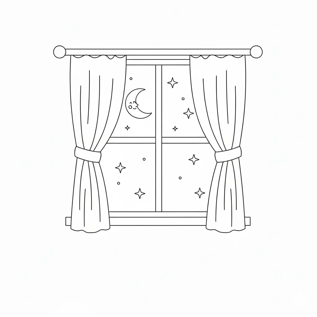 דף צביעה של חלון עם כוכבים לילדים בקטגוריה לילה טוב. מתאים לילדים מגיל 3 ומעלה, להדפסה בחינם עם קווים ברורים וציור ידידותי