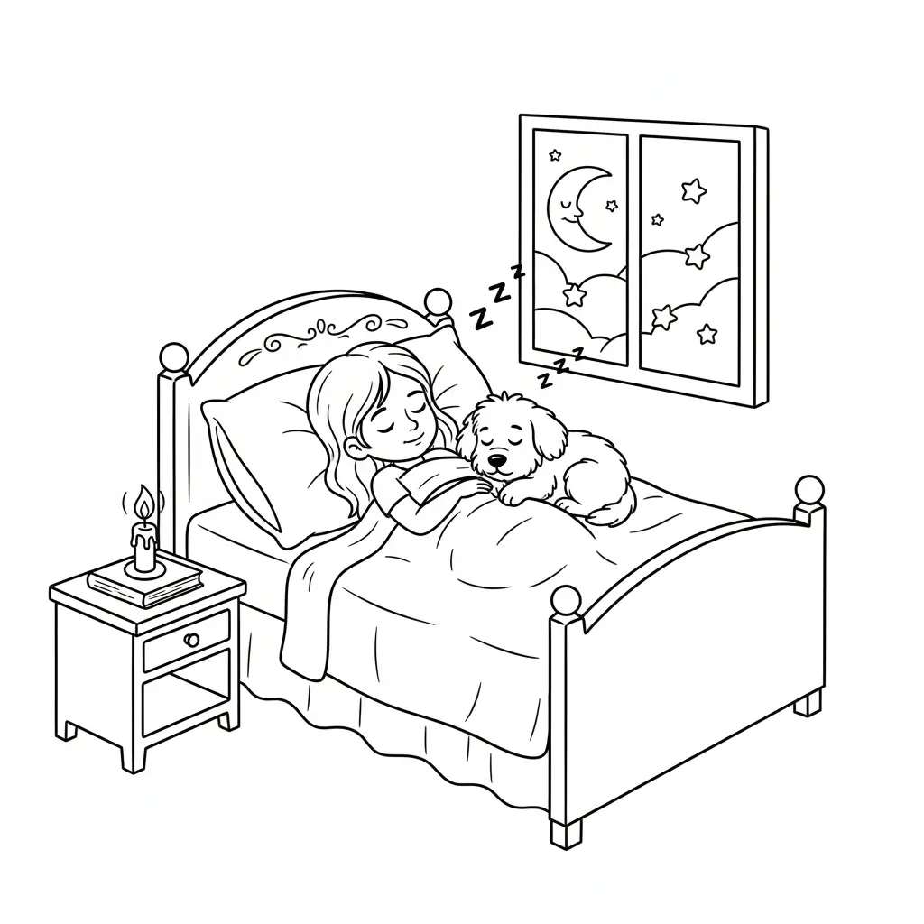דף צביעה של ילדה וכלבלב ישנים לילדים בקטגוריה לילה טוב. מתאים לילדים מגיל 3 ומעלה, להדפסה בחינם עם קווים ברורים וציור ידידותי
