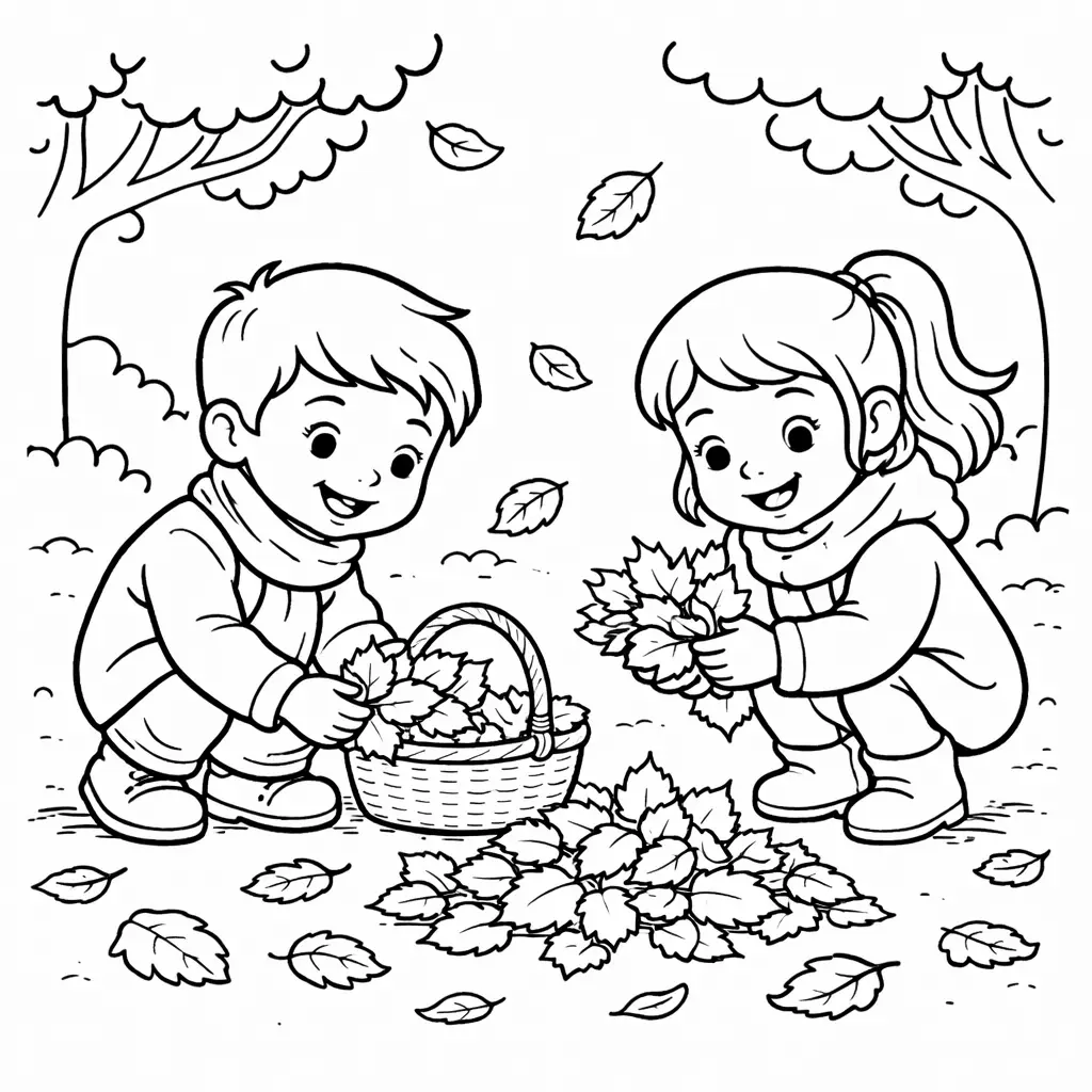 דף צביעה של ילדים אוספים עלים בסתיו