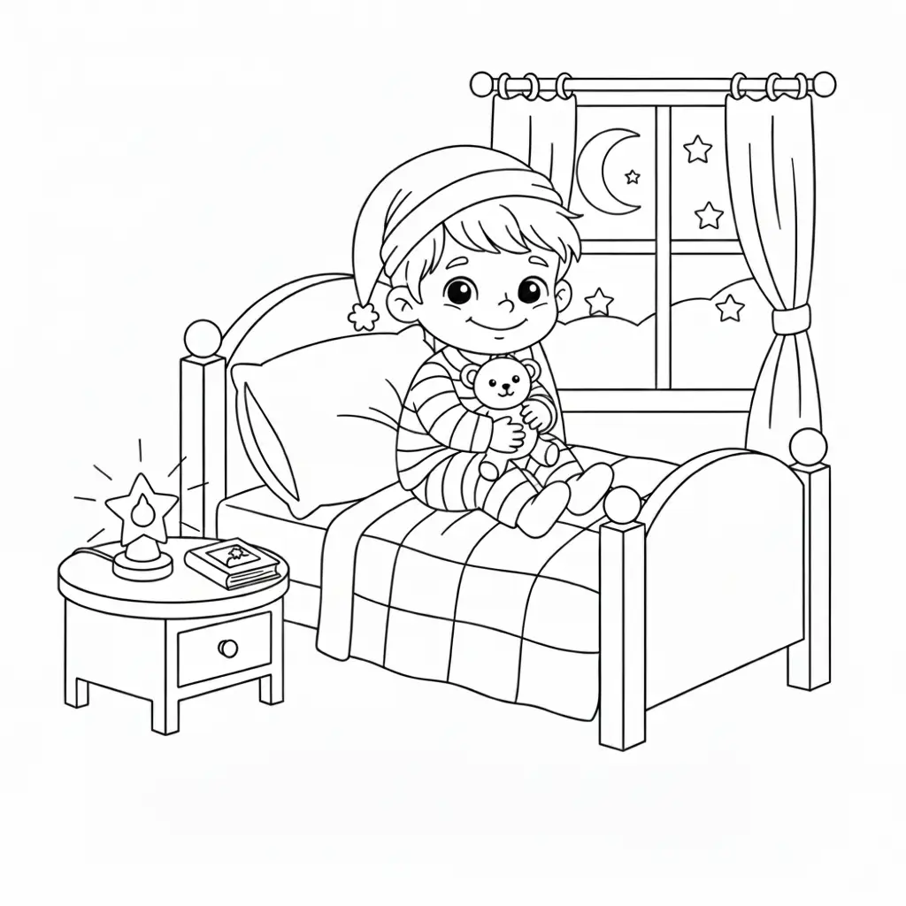דף צביעה של ילד במיטה לפני שינה לילדים בקטגוריה לילה טוב. מתאים לילדים מגיל 3 ומעלה, להדפסה בחינם עם קווים ברורים וציור ידידותי