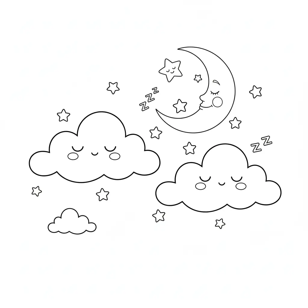 דף צביעה של ירח ועננים ישנים לילדים בקטגוריה לילה טוב. מתאים לילדים מגיל 3 ומעלה, להדפסה בחינם עם קווים ברורים וציור ידידותי