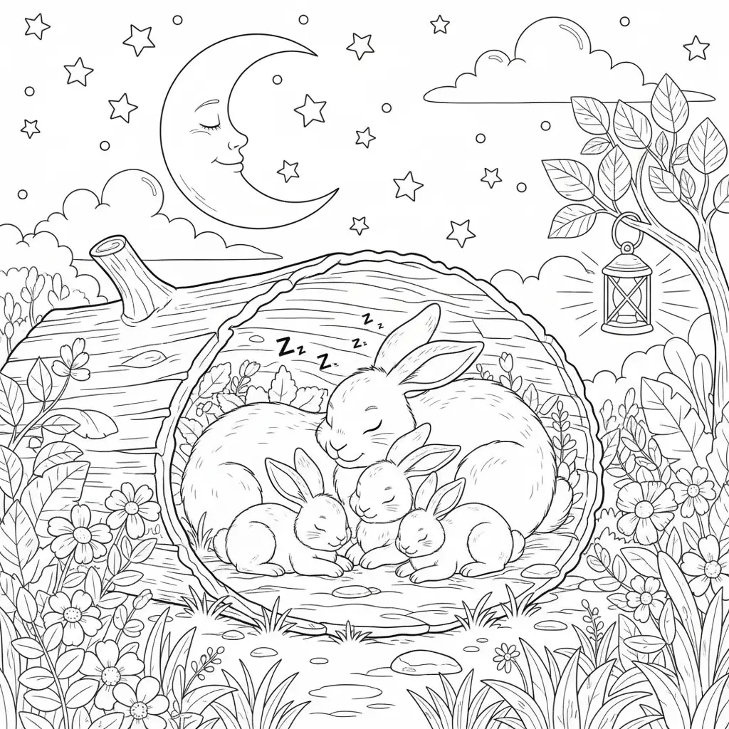 דף צביעה של משפחת ארנבים ישנים לילדים בקטגוריה לילה טוב. מתאים לילדים מגיל 3 ומעלה, להדפסה בחינם עם קווים ברורים וציור ידידותי
