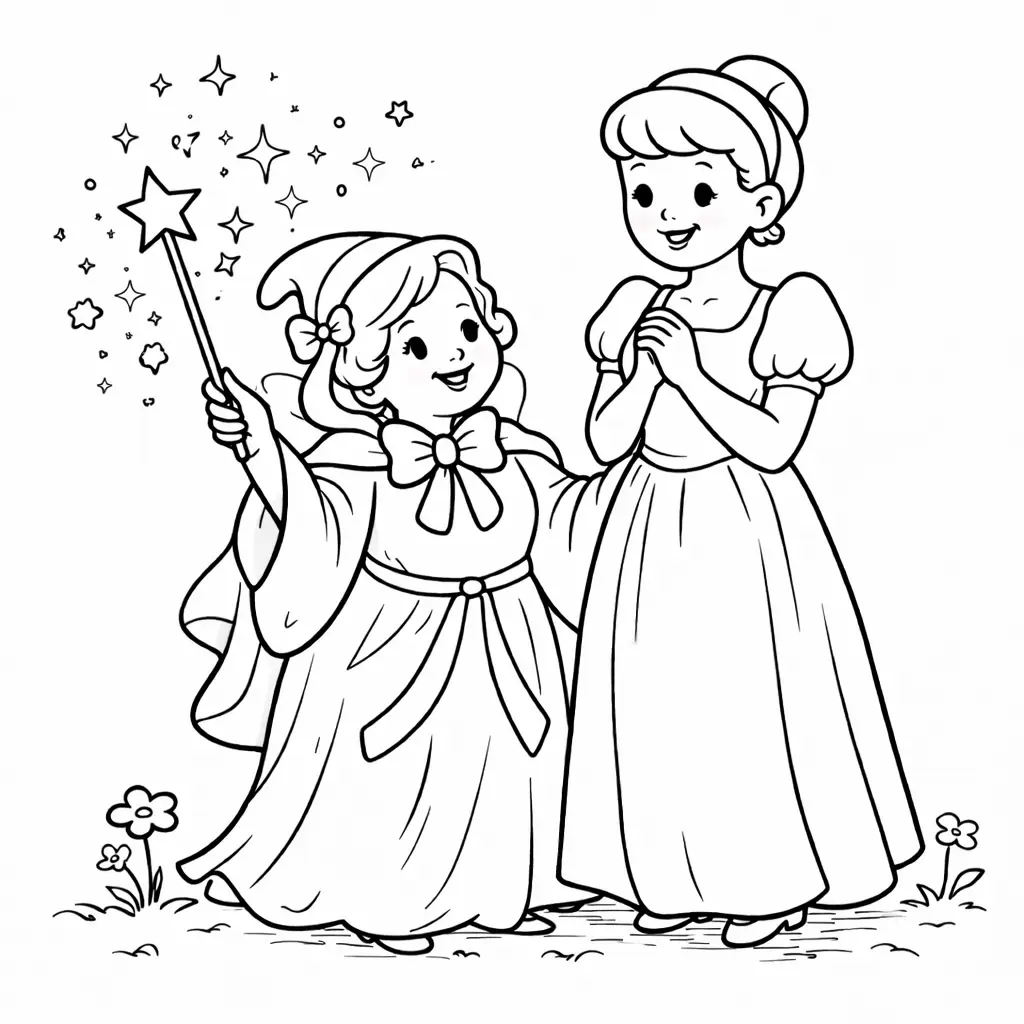 דף צביעה של סינדרלה והפיה הסנדקית לילדים בקטגוריה אגדות. מתאים לילדים מגיל 3 ומעלה, להדפסה בחינם עם קווים ברורים וציור ידידותי