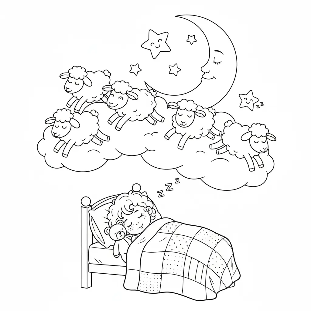 דף צביעה של ספירת כבשים לילדים בקטגוריה לילה טוב. מתאים לילדים מגיל 3 ומעלה, להדפסה בחינם עם קווים ברורים וציור ידידותי
