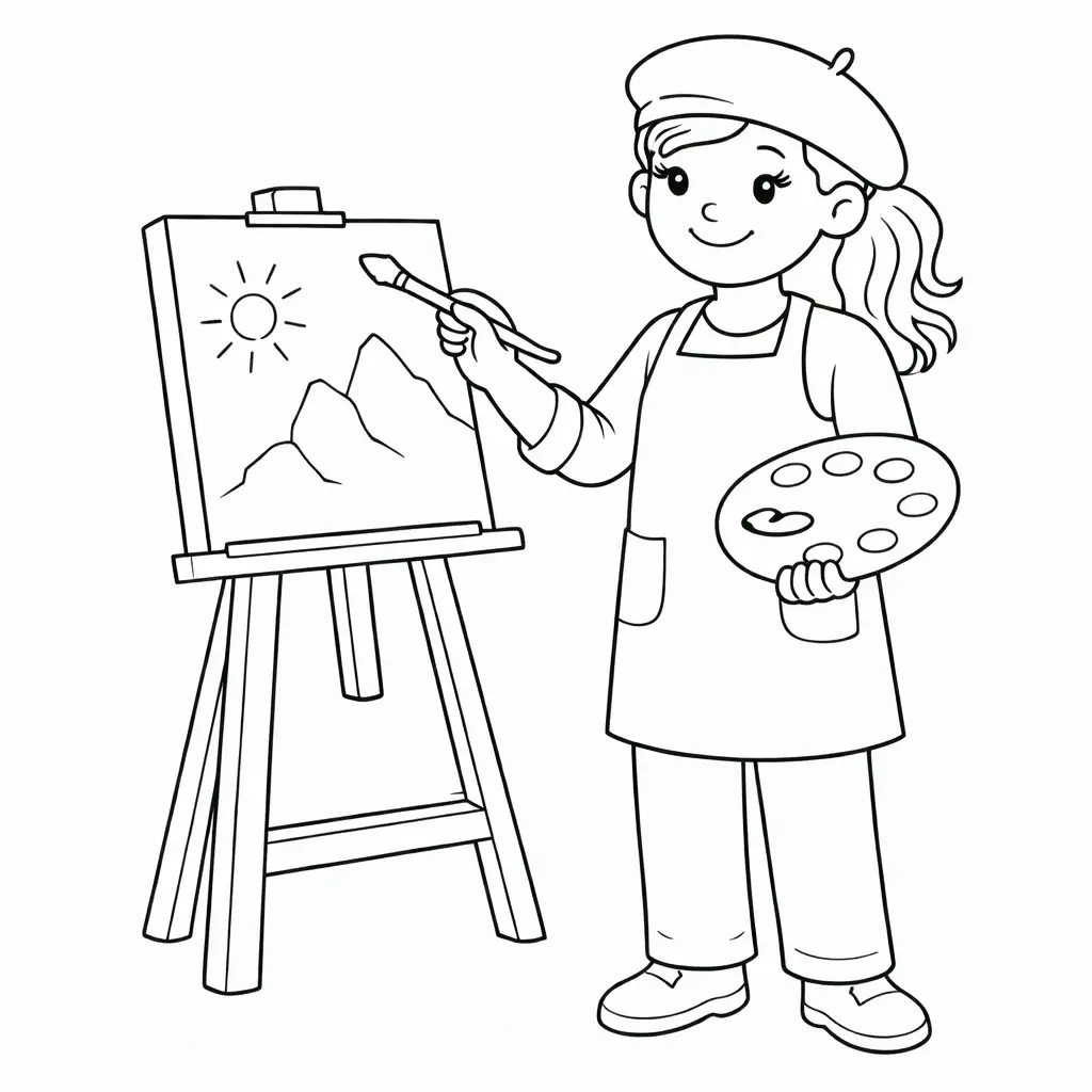 דף צביעה של ציירת לילדים בקטגוריה מקצועות. מתאים לילדים מגיל 3 ומעלה, להדפסה בחינם עם קווים ברורים וציור ידידותי