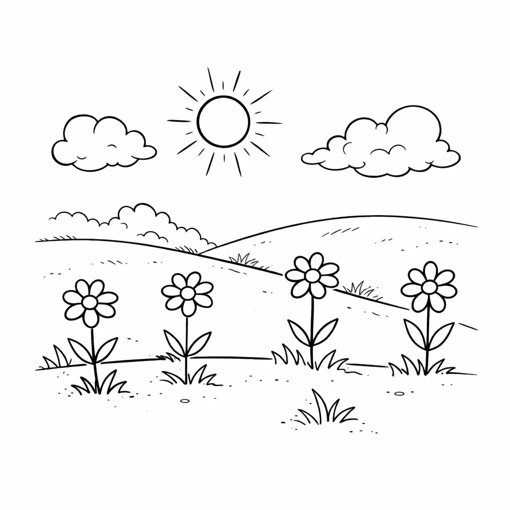 דף צביעה של שדה פרחים לילדים בקטגוריה טבע. מתאים לילדים מגיל 3 ומעלה, להדפסה בחינם עם קווים ברורים וציור ידידותי