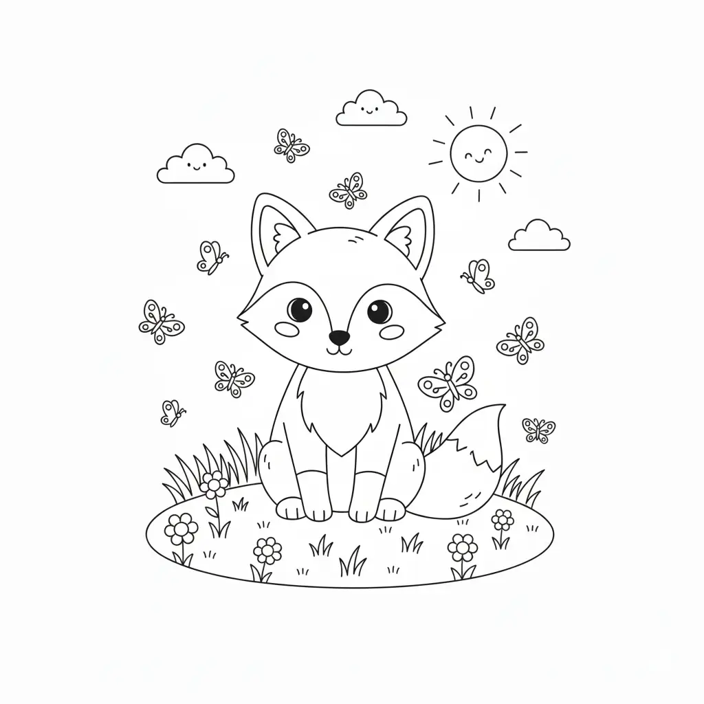 דף צביעה של שועל ופרפרים לילדים בקטגוריה שועלים. מתאים לילדים מגיל 3 ומעלה, להדפסה בחינם עם קווים ברורים וציור ידידותי