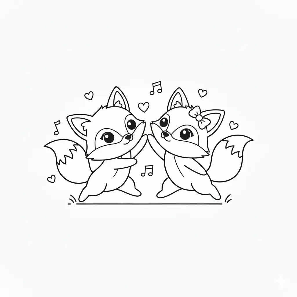 דף צביעה של שועל ושועלה רוקדים לילדים בקטגוריה שועלים. מתאים לילדים מגיל 3 ומעלה, להדפסה בחינם עם קווים ברורים וציור ידידותי