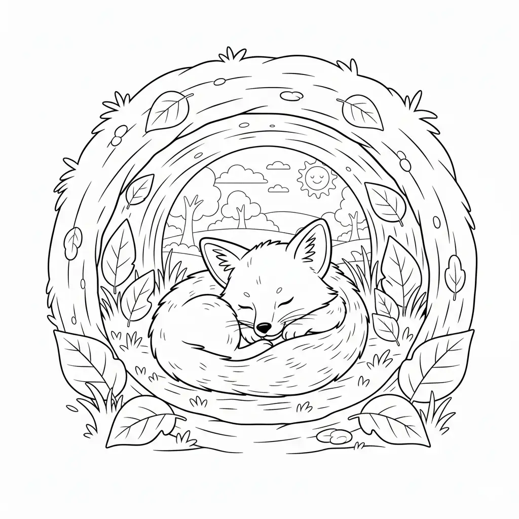 דף צביעה של שועל בערמת עלי שלכת בסתיו