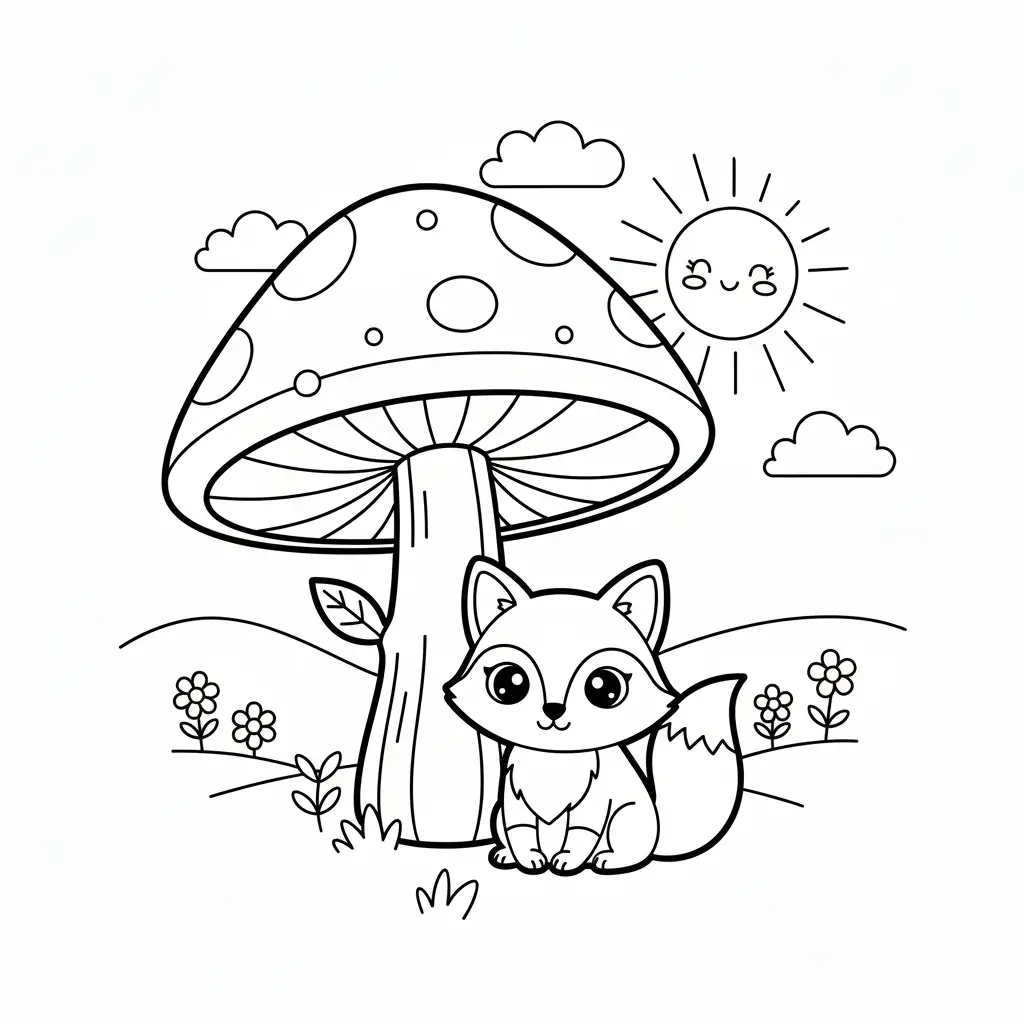 דף צביעה של שועל מתחת לעץ פטריה לילדים בקטגוריה שועלים. מתאים לילדים מגיל 3 ומעלה, להדפסה בחינם עם קווים ברורים וציור ידידותי