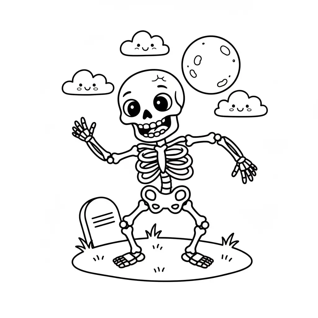 דף צביעה של שלד רוקד האלווין לילדים בקטגוריה האלווין. מתאים לילדים מגיל 3 ומעלה, להדפסה בחינם עם קווים ברורים וציור ידידותי