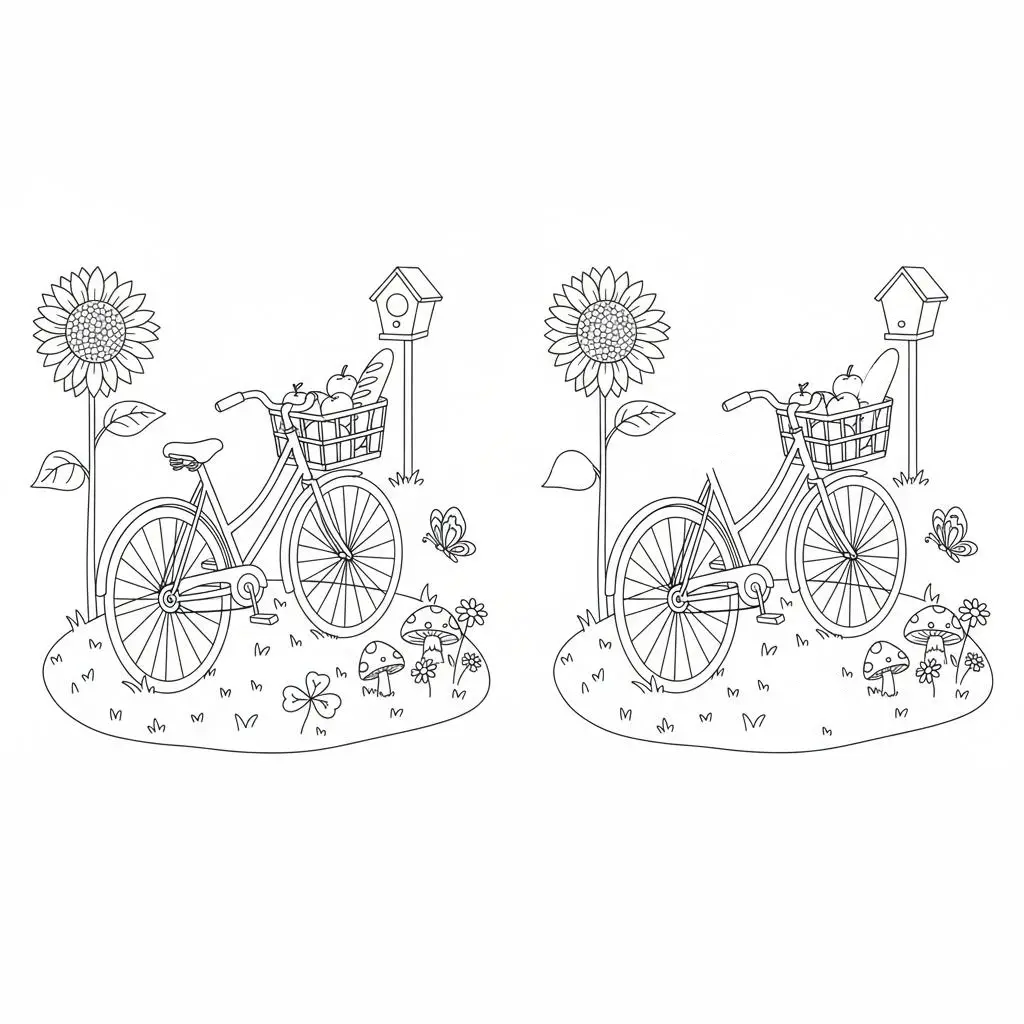 דף צביעה של מצא את ההבדלים אופניים 5 הבדלים לילדים בקטגוריה מצא את ההבדלים. מתאים לילדים מגיל 3 ומעלה, להדפסה בחינם עם קווים ברורים וציור ידידותי